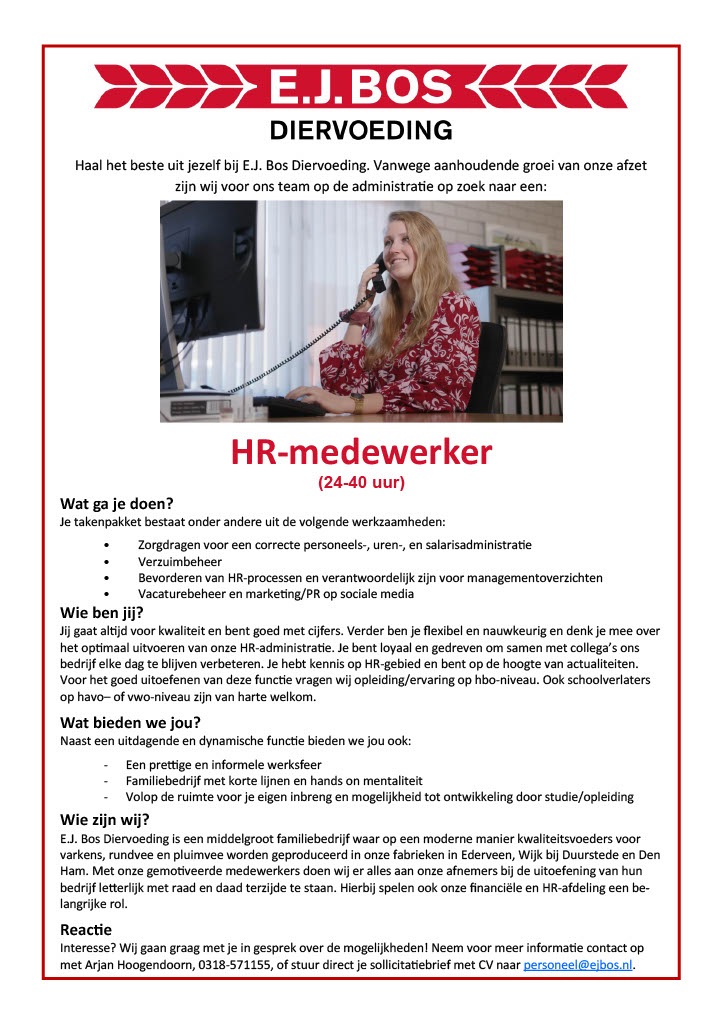 E.J. Bos Diervoeding is een modern, groeiend, middelgroot bedrijf in het midden van het land. Kwaliteit, een persoonlijke, klantgerichte benadering en een scherpe calculatie hebben in de achterliggende jaren voor een verdubbeling van de omzet gezorgd. In onze moderne fabrieken in Ederveen en Wijk bij Duurstede worden voeders van hoge kwaliteit geproduceerd voor rundvee, voor varkens en voor pluimvee. Naast kwaliteitsvoeders biedt E.J. Bos Diervoeding een breed pakket aan andere diensten. Met onze ruim 50 gemotiveerde medewerkers doen wij er alles aan om onze afnemers bij de uitoefening van hun bedrijf letterlijk met raad en daad terzijde te staan.